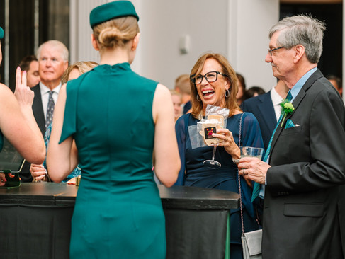 To bring this restaurant-inspired reception to life, we moved away from traditional formalities to lean into the feeling of arriving at a world-class hotel bar. In lieu of a static escort display, guests were greeted by live hostesses who welcomed them with champagne and personally escorted them to their tables. This high-touch approach transformed the ballroom into a living, breathing space from the very first moment—a signature element of a luxury wedding where every guest touchpoint is curated with intention.